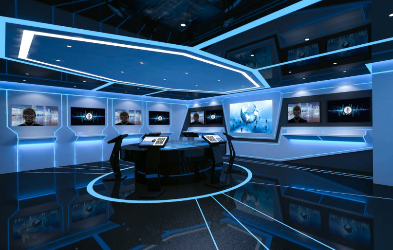 步入展廳時(shí),通過(guò)切換背景幕墻畫面和音樂(lè),烘托氣氛,產(chǎn)生震撼力。