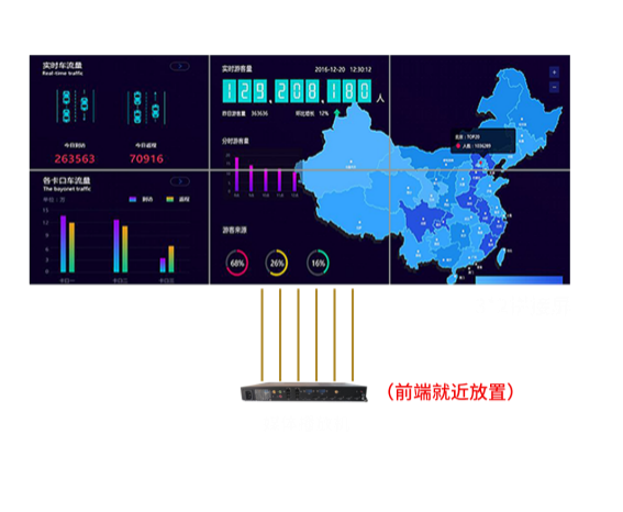 2、 通過(guò)多臺(tái)主機(jī)輸出顯示信號(hào),經(jīng)過(guò)拼接圖象處理器來(lái)達(dá)到拼接屏全屏顯示和分屏顯示的切換效果,導(dǎo)致現(xiàn)場(chǎng)安裝復(fù)雜、布線繁瑣;