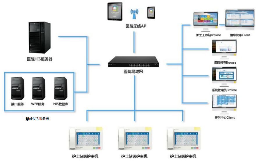 能與 HIS 系統(tǒng)聯(lián)網(wǎng),將患者的住院信息和護理信息自動發(fā)布到各個護理通訊終端, 為患者診療、護理方案的選擇搭建了一個優(yōu)越的硬件平臺。