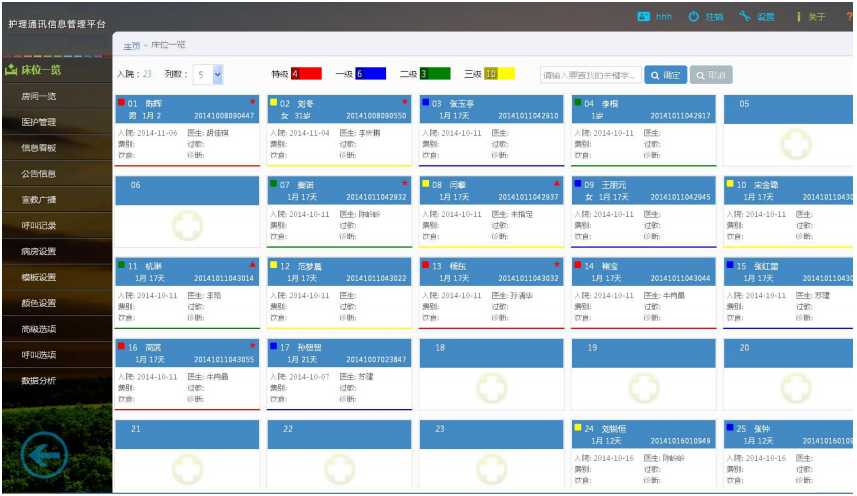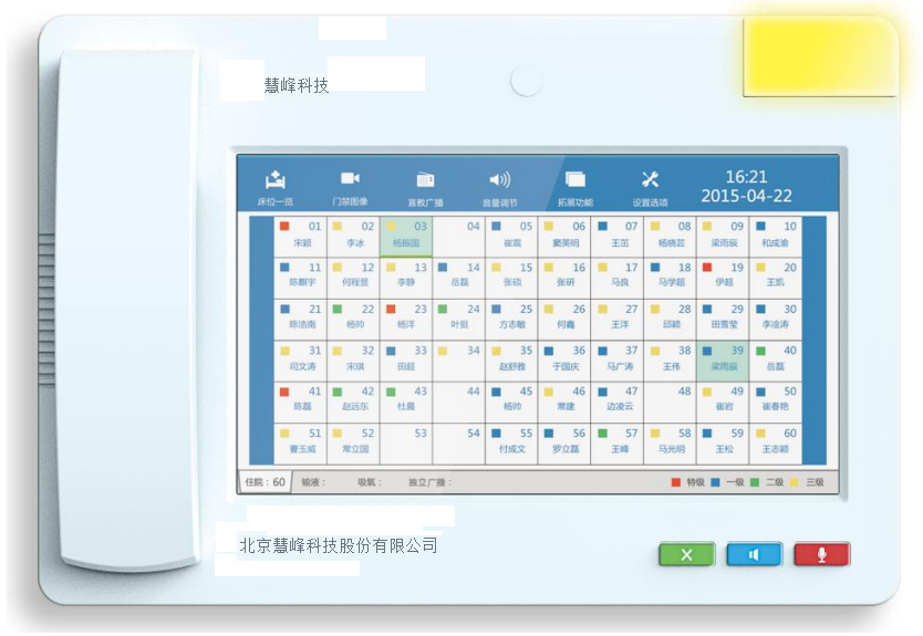 每個護理通訊終端都有醒目的護理標識,采用 7 色(紅、藍、綠、黃、粉、青、 白)警示級別顏色,讓護理工作更加規(guī)范統(tǒng)一。
