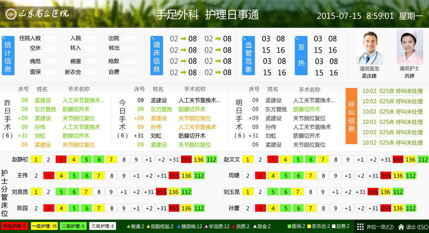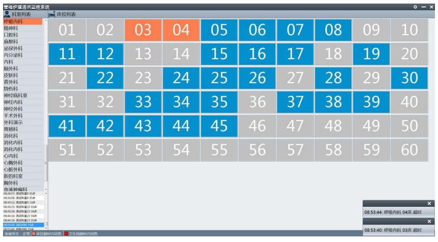 ● 可在總值班室或呼叫中心使用,實時監(jiān)控各病區(qū)的呼叫處理情況,直觀顯示各病區(qū) 的床位及入住情況,以便及時反應出系統(tǒng)的運行狀態(tài),提高響應速度,優(yōu)化服務質量。