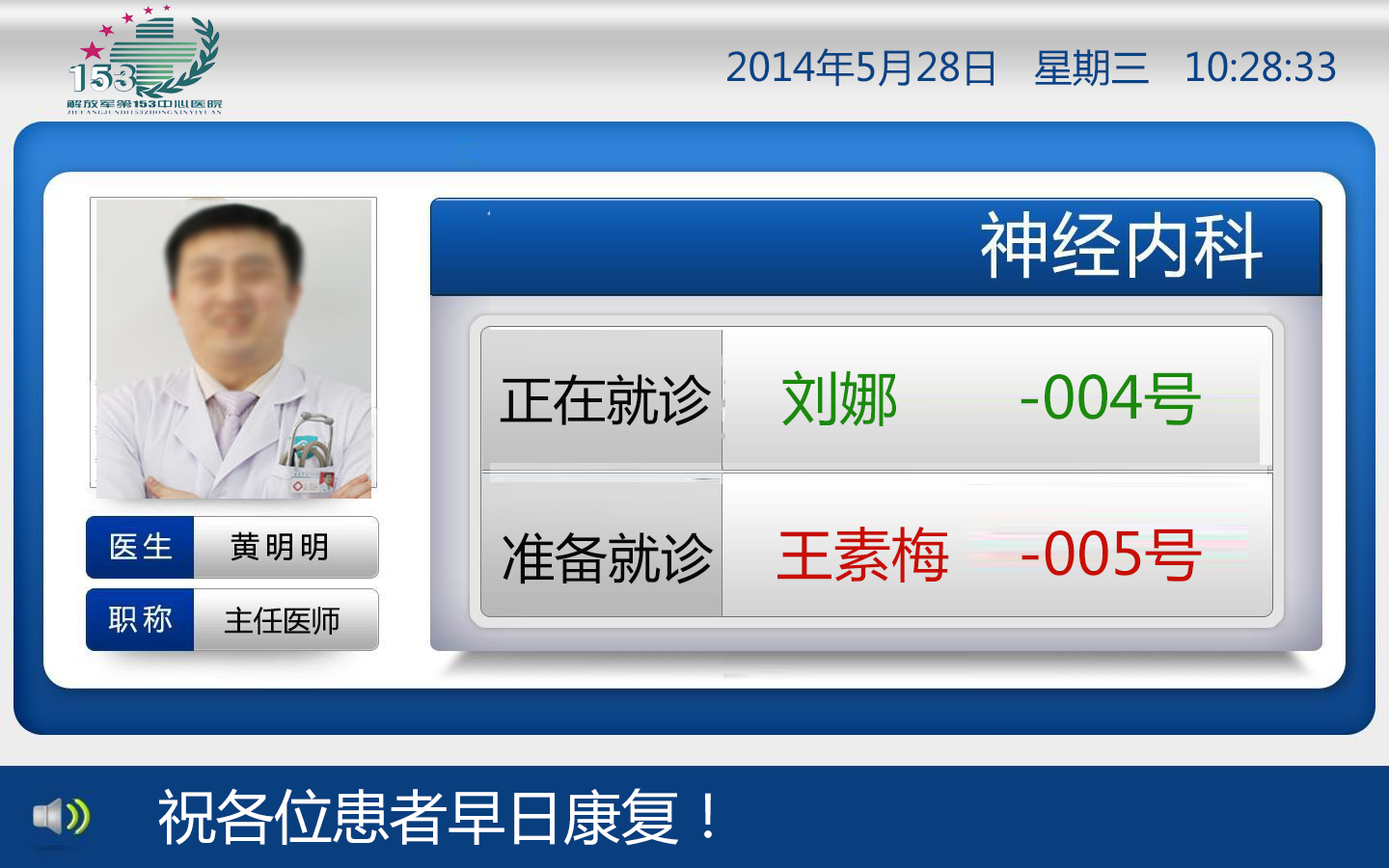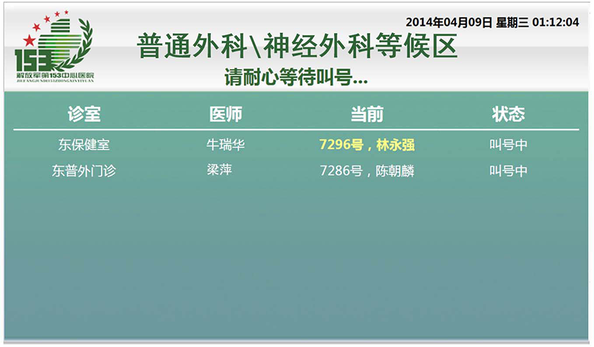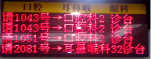 屏幕顯示采用電視機(jī),每個屏幕顯示5-10人的排隊(duì)信息,內(nèi)容:排隊(duì)號,姓名,檢查房間號等。語音呼叫采用語音自動合成,可以用男聲或女聲,呼叫內(nèi)容一般為:“請XX號,XXX(姓名)請到XXX房間檢查?!?nbsp;
